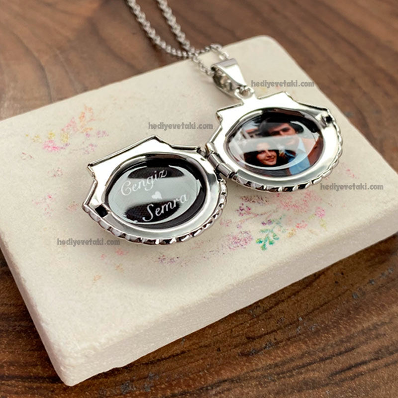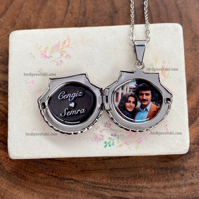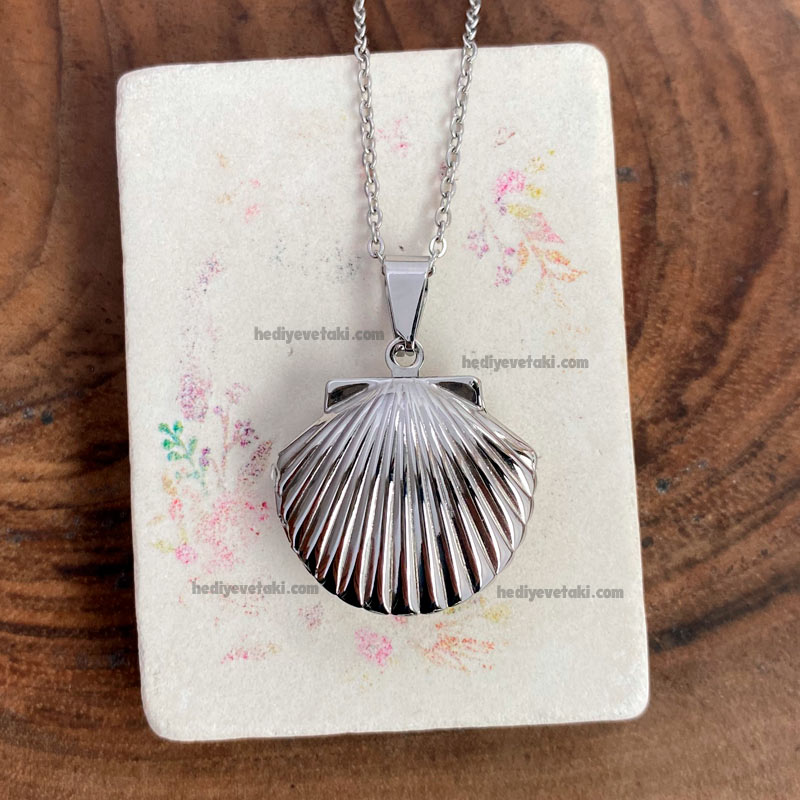 Minimalist tasarımı ve parlak gümüş tonu ile bu deniz kabuğu kapaklı kolye, zarafet ve anlamı bir arada sunar. İç kısmında iki yüze yerleştirilen fotoğraf ve isim, bu kolyeyi sıradan bir takıdan çok daha fazlasına dönüştürür.