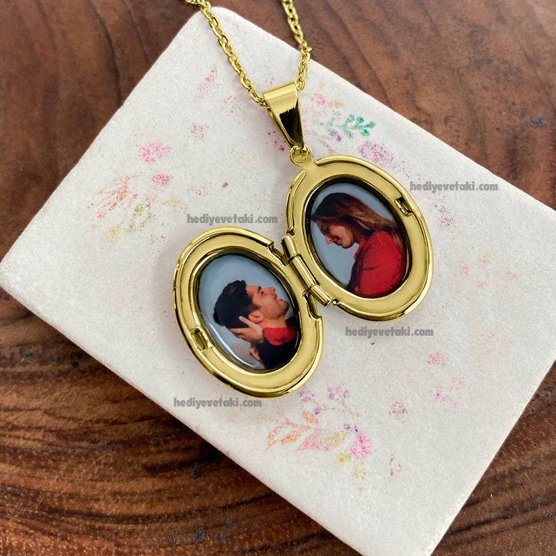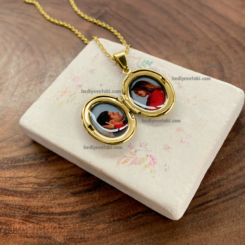 Kolyenin en özel kısmı içinin açılabilir tasarımıdır. Kapak yana doğru açıldığında içeride iki adet fotoğraf yuvası çıkar. Bu alanlara sevdiklerinizin fotoğraflarını yerleştirerek kolyeyi tamamen kişisel bir hatıraya dönüştürebilirsiniz. Fotoğraflar özel polimer kaplama sayesinde suya, tere ve günlük kullanıma dayanıklıdır. Bu teknoloji sayesinde fotoğraflar zamanla solmaz, bozulmaz ve uzun yıllar boyunca ilk günkü canlılığını korur.